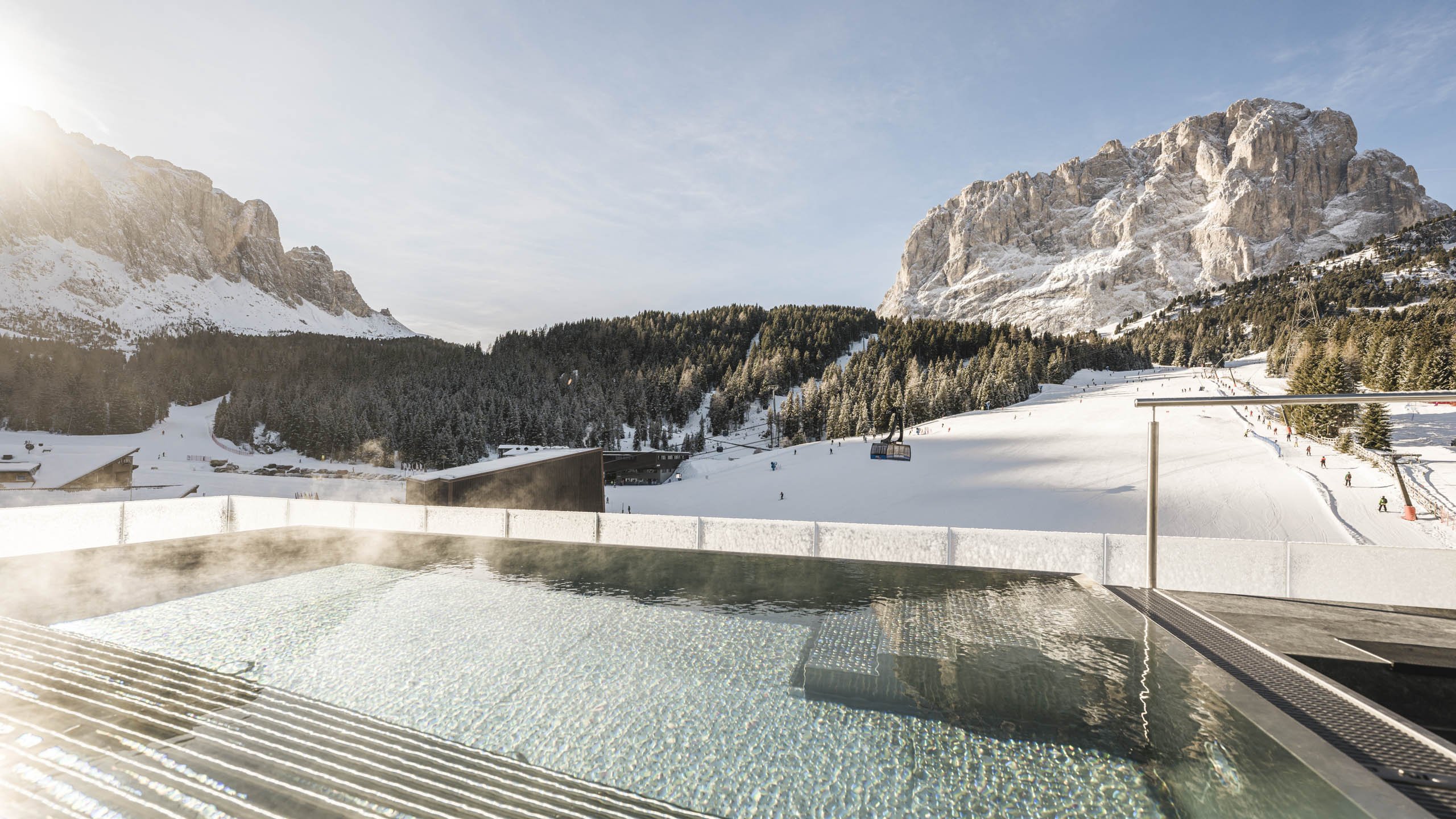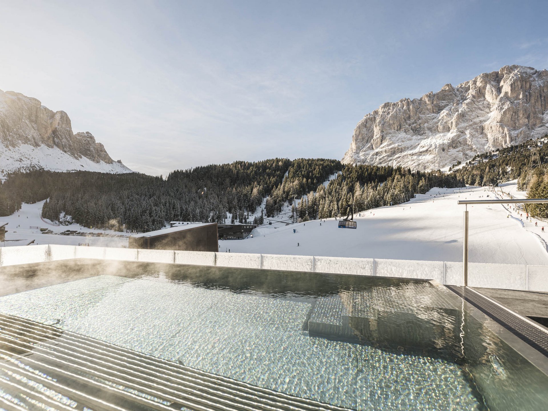 After an active day in the mountains, or simply for a day out, there's no better place to relax than our exclusive Sky Spa – high up with unobstructed views of the mighty peaks of the Sella massif and the Sassolungo. Immerse yourself in a world of peace and regeneration, feel the soothing heat in our Finnish sauna, and breathe deeply in the aroma steam bath to relax body and mind. Experience a refreshing kick in the cold water bath tub or ice fontain, and let your thoughts wander in the open-air Sky Whirlpool with 35 degrees – accompanied by the panorama of the majestic Dolomites.