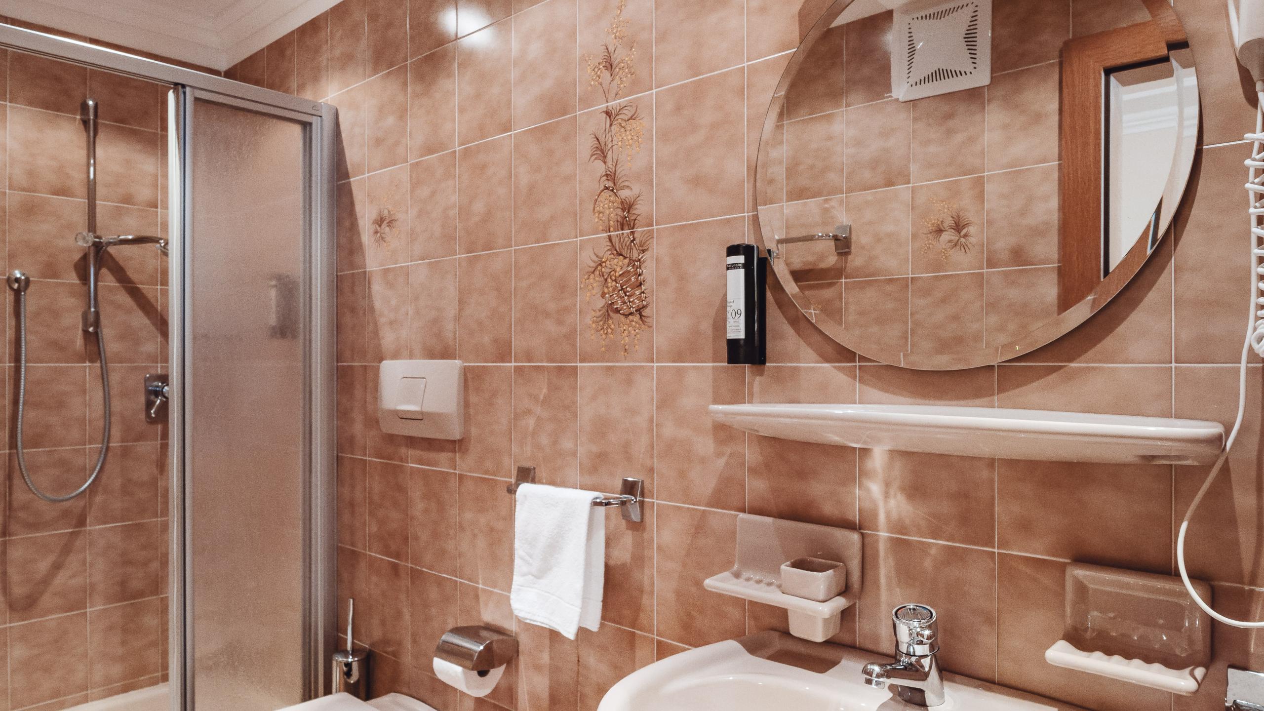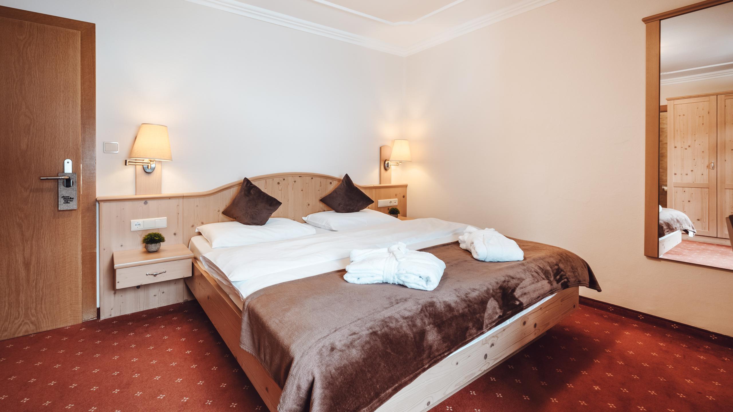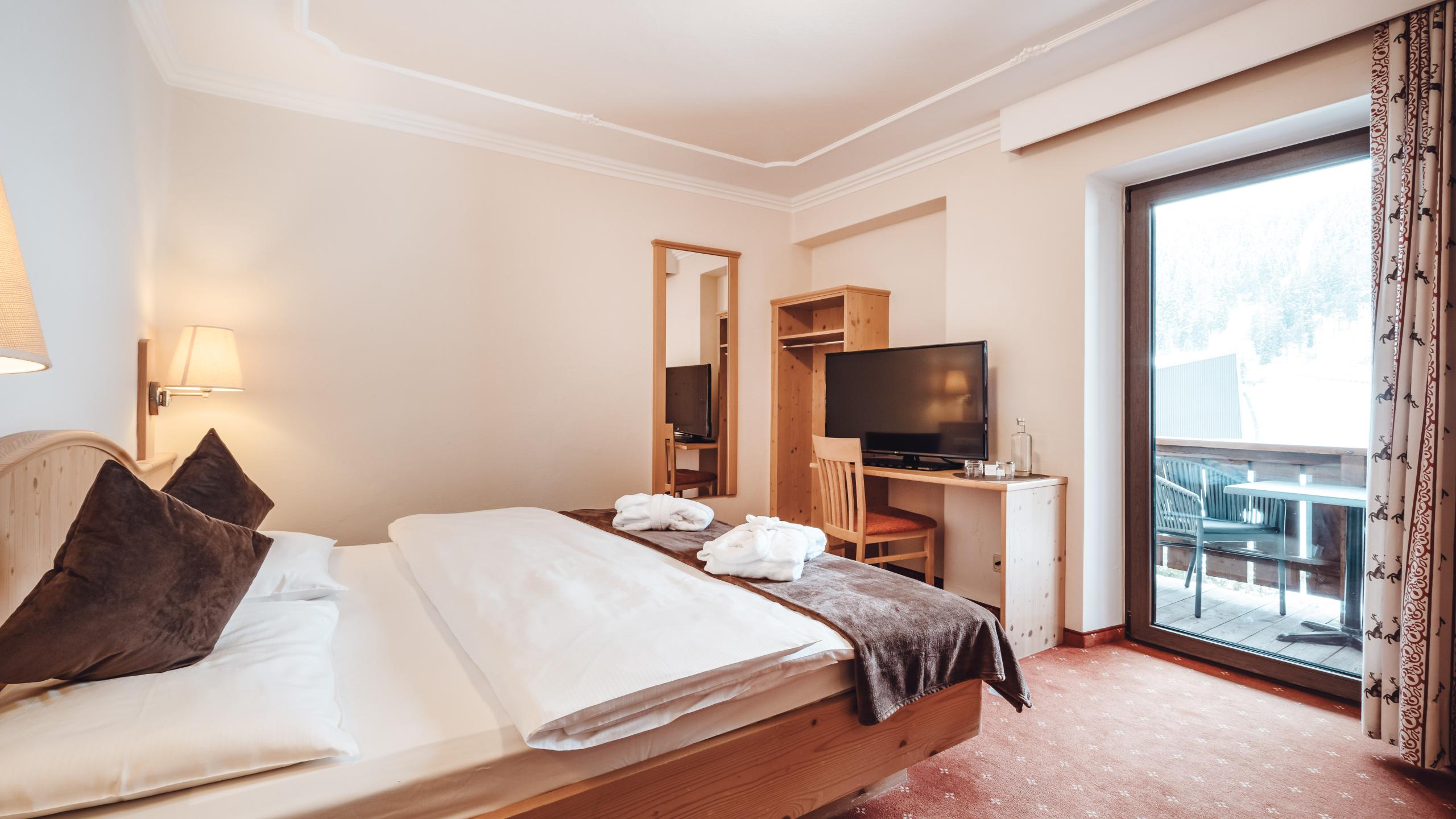 Comfortable double room with double bed for 2 people, panoramic balcony facing the Dolomites/ski slope, desk with satellite TV, bathroom with shower, and carpeted flooring.