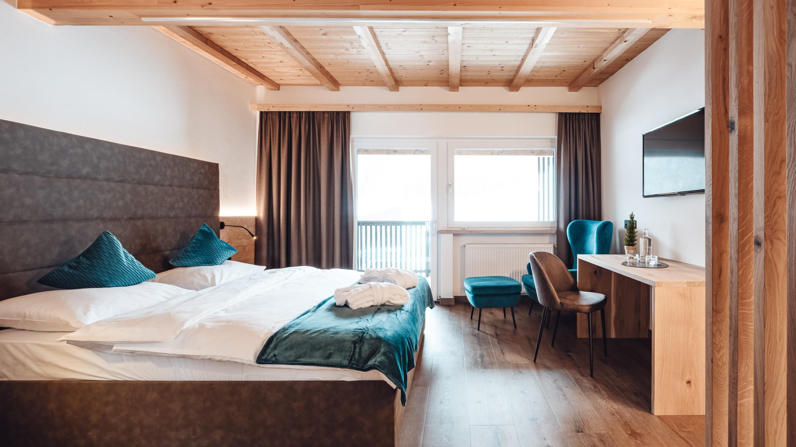 Ihr neu renovierter Wohn(t)raum mit direktem Dolomitenblick: In der vierten Etage erwartet Sie unser Doppelzimmer Lunae. Heimisches Eichenholz, Holzboden, bequeme Boxspringbetten, gemütliche Sessel zum Verweilen und ein geräumiger Balkon – hier werden Sie sich wohlfühlen!