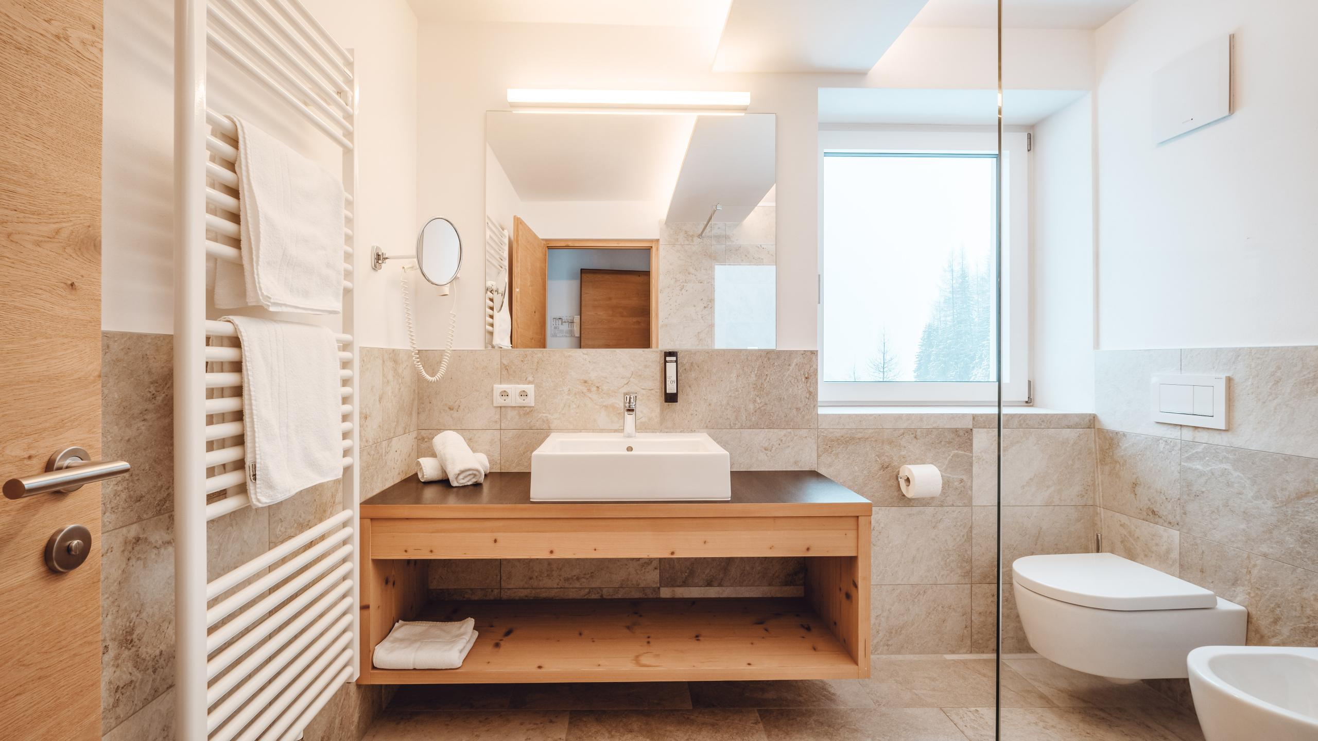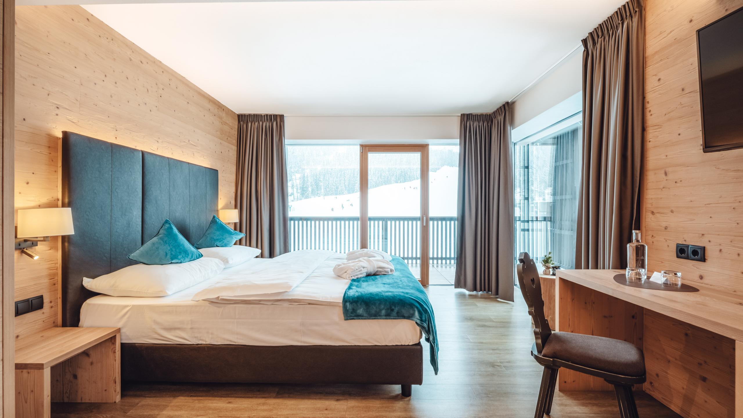 Wohlfühlambiente vom ersten Moment an: willkommen in Ihrem Montes-Zimmer. Entspannen Sie auf dem Panoramabalkon mit Blick auf die Dolomiten bzw. die schönsten Pisten. Großflächige Fenster, ein Boden in Holzoptik, ein Sofa, ein Sat-TV, ein Schreibtisch und ein modern-geräumiges Bad mit Dusche erwarten Sie!