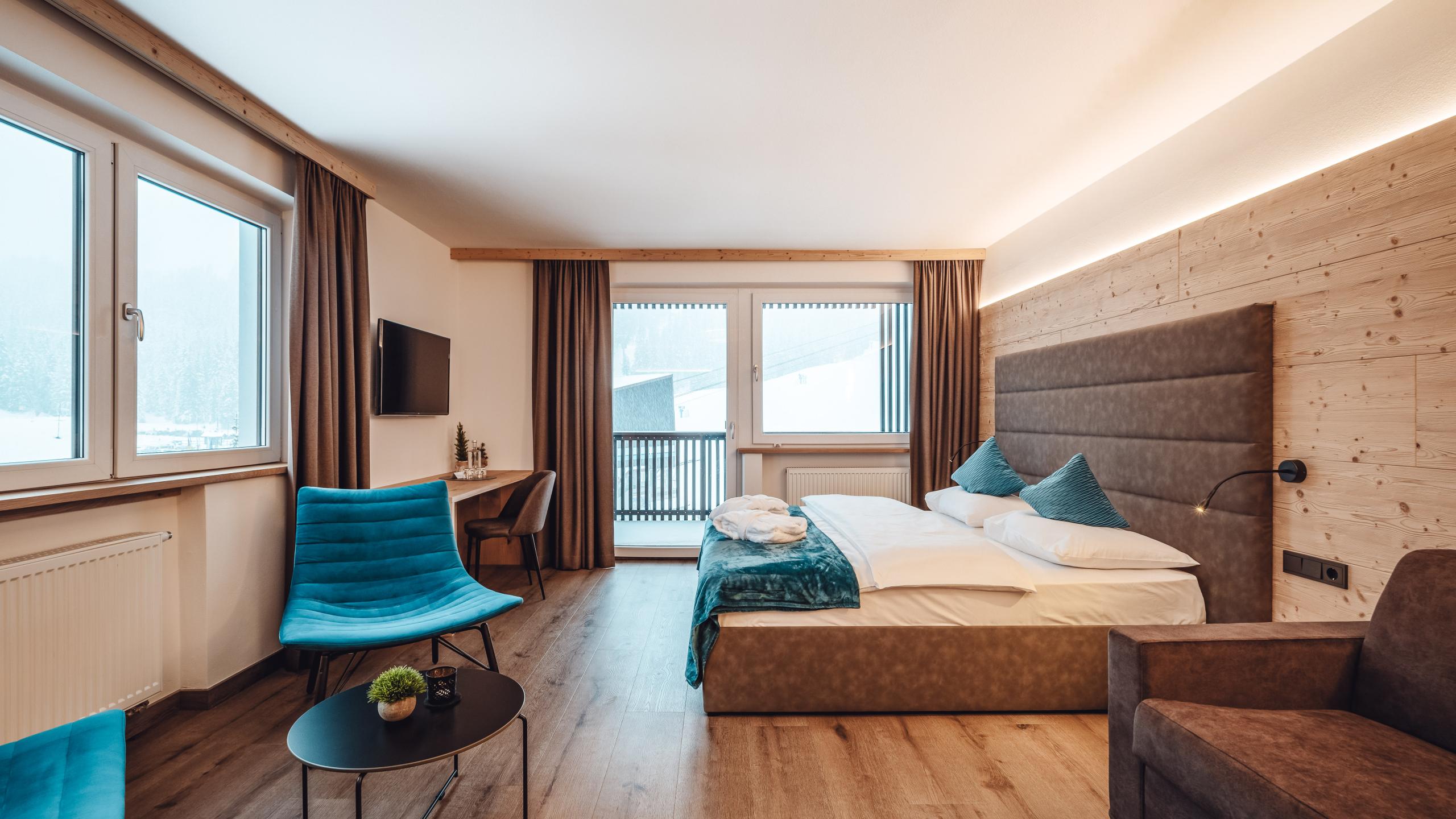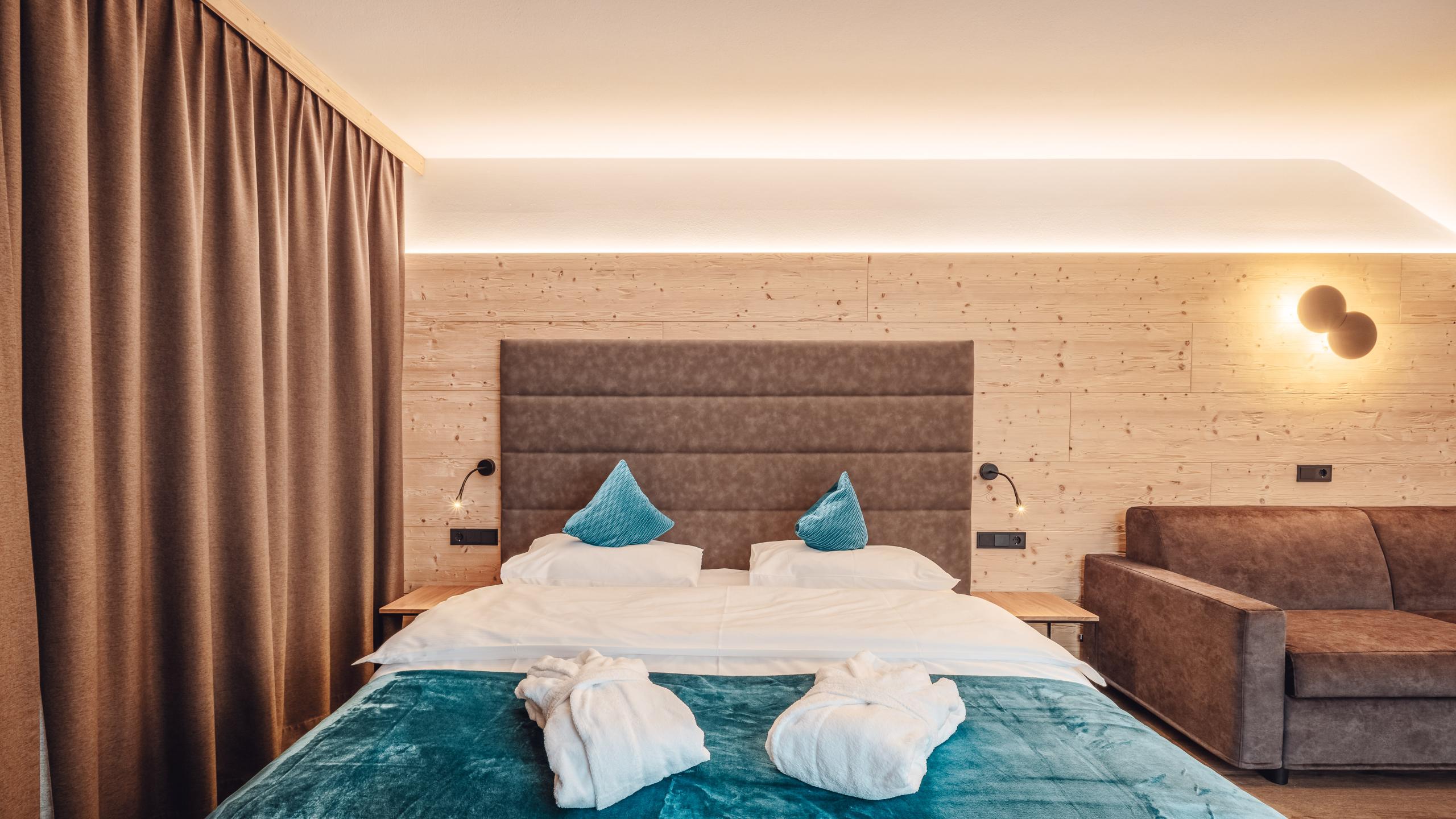 Zuhause-Gefühl de luxe: Genießen Sie Ihre Auszeit im neu renovierten Doppelzimmer Pinea. Heimisches Eichenholz, bequeme Boxspringbetten, eine Wohnecke mit gemütlichen Sesseln, ein geräumiger Balkon mit direktem Blick auf die Dolomiten – Sie werden sich vom ersten Moment an wohlfühlen!