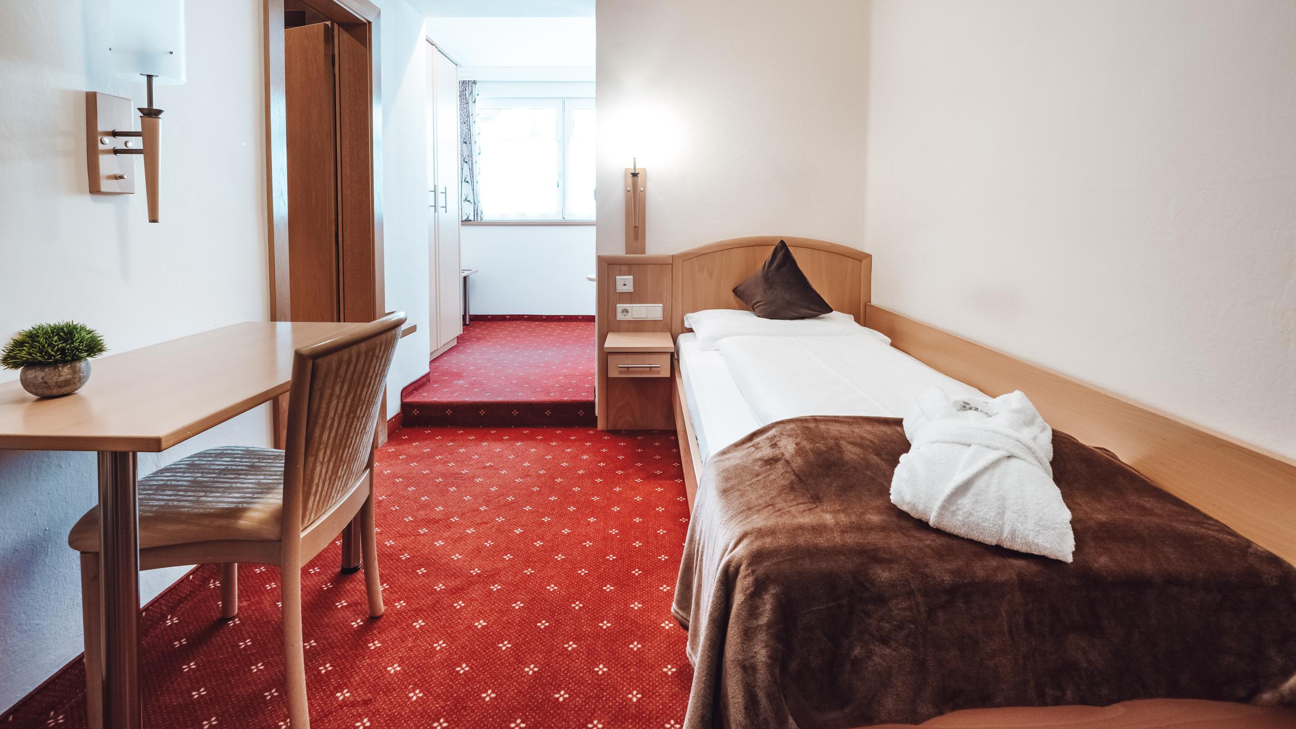 Komfortables Einzelzimmer mit Leseecke im 3. Stock, Teppichboden, Einzelbett, Schreibtisch, Sat-TV und Badezimmer mit Dusche. Kein Balkon vorhanden.